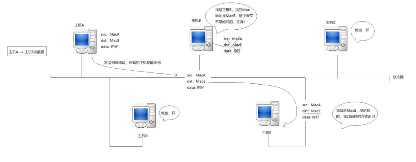 src与dst地址相同则做处理,因此只有主机E会做回应。