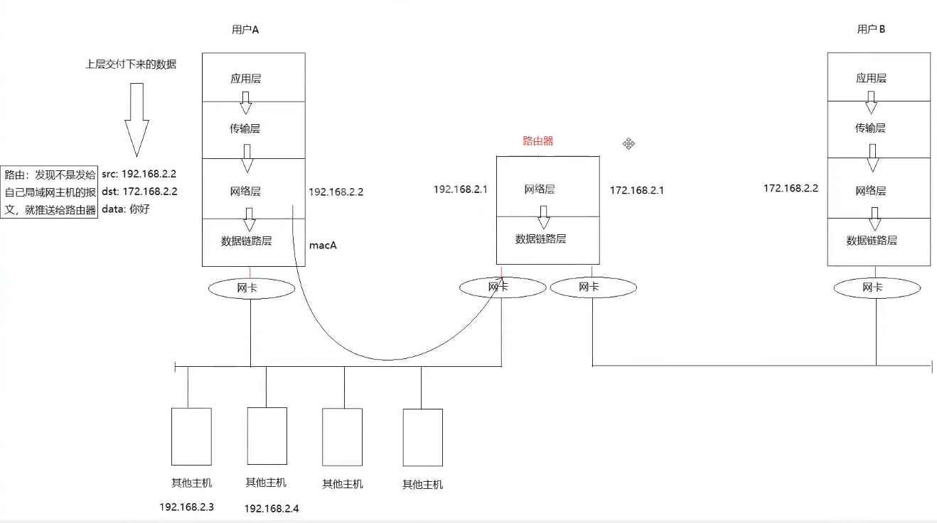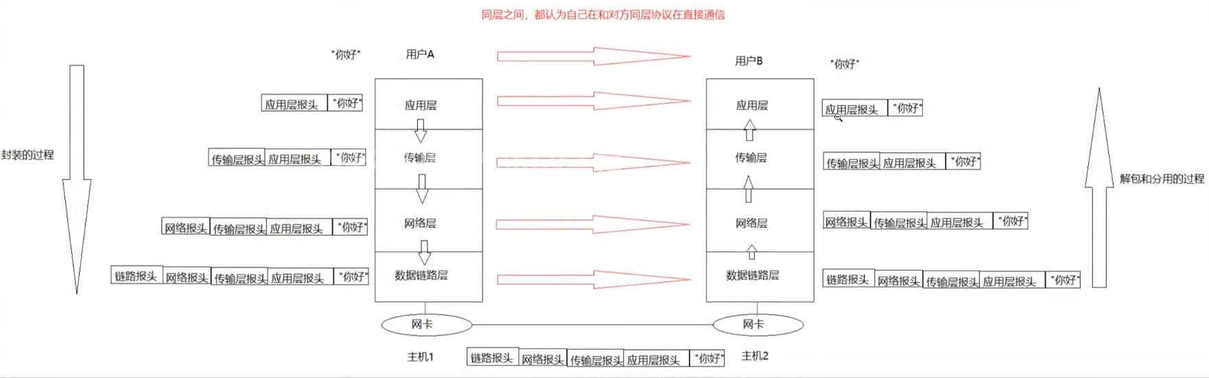 因此:两台局域网内pc之间通过网络进行数据传递应当是,由用户层自顶而下,经过网卡A传递给网卡B时,再由网卡B自底而上交付给用户层。