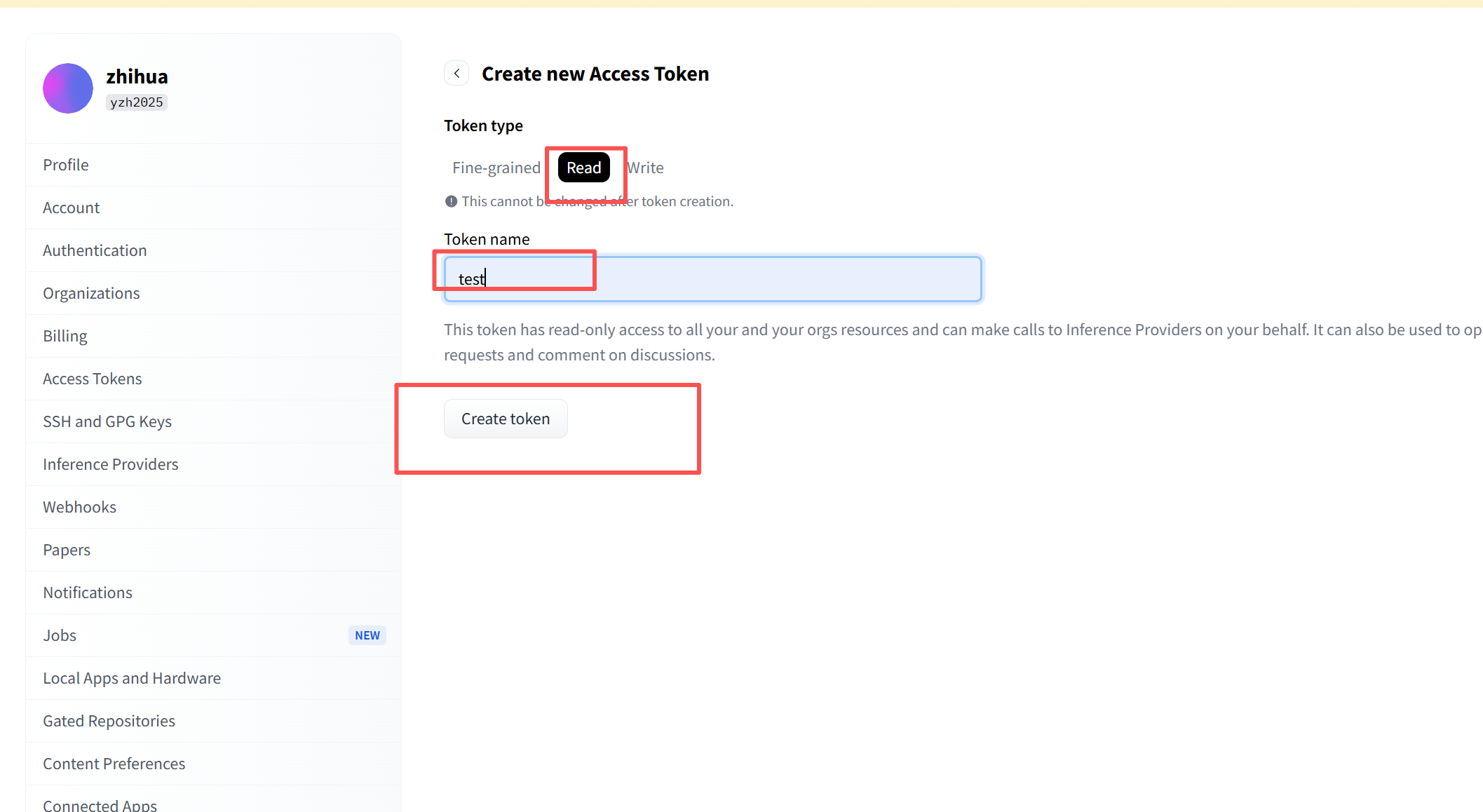 Hugging Face是一个大模型的github,可以从这个网站中拿到模型和数据集。你要做的就是首先注册一个账号,之后进入账号页面,如下图。之后Create new token。