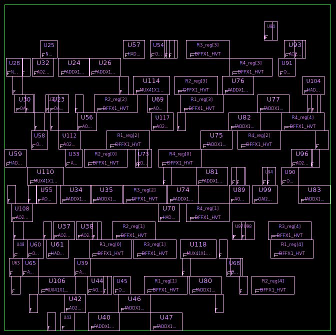 此时综合结果的的版图如图5所示,其中绿色线表示的既是是芯片(Die)区域也是核心(Core)区域。
