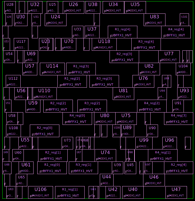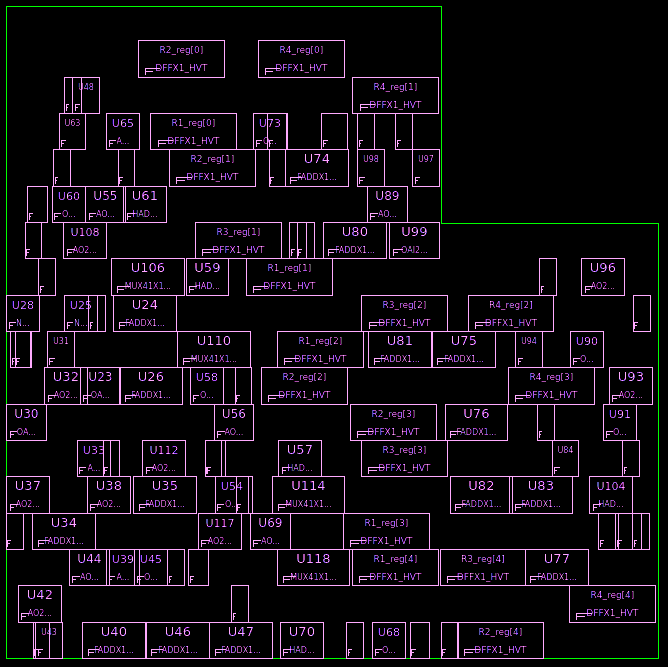 图2展示了一个综合结果的版图,其中绿色线表示的既是是芯片(Die)区域也是核心(Core)区域。