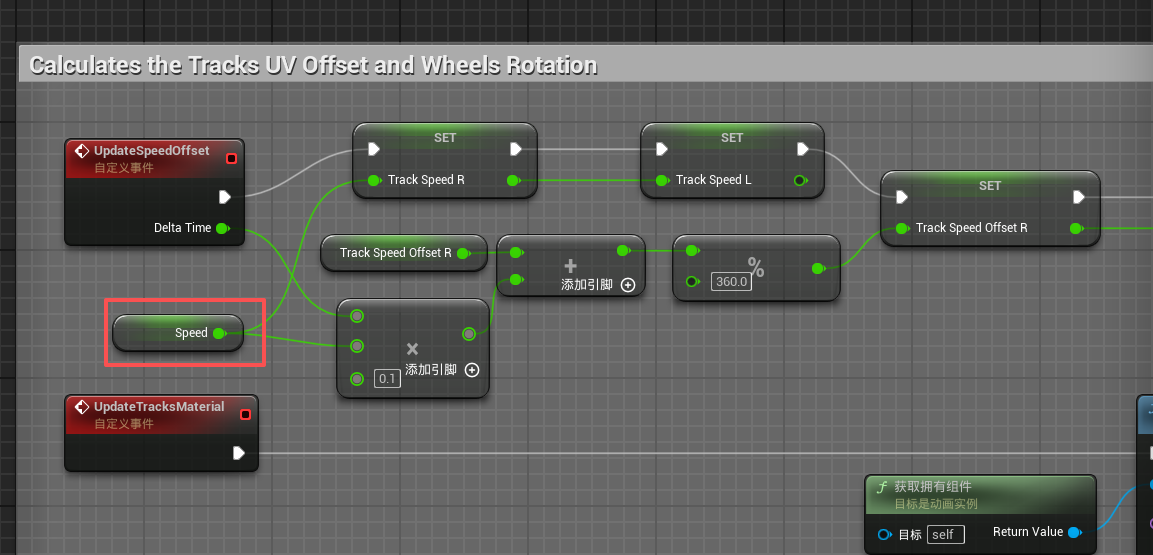 1.车轮蓝图动画:用speed变量更新轮子速度。