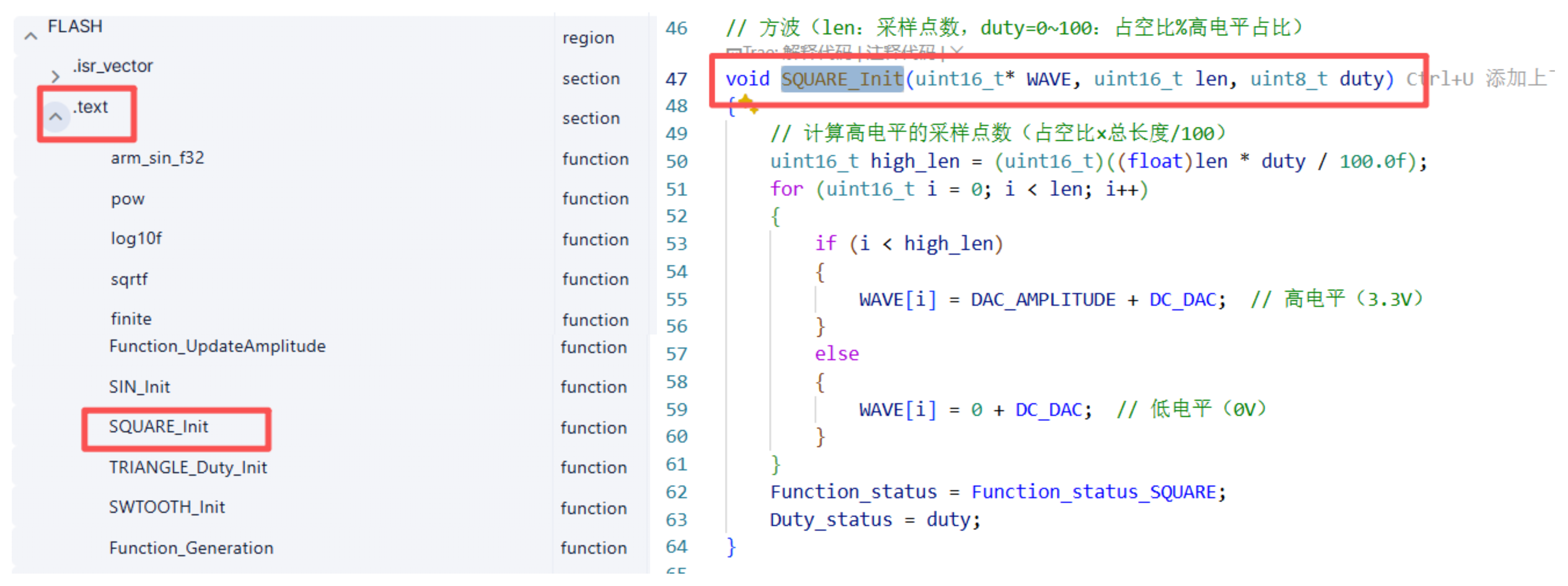 text数据段示例(函数SQUARE_Init被编译后归类到Flash text)