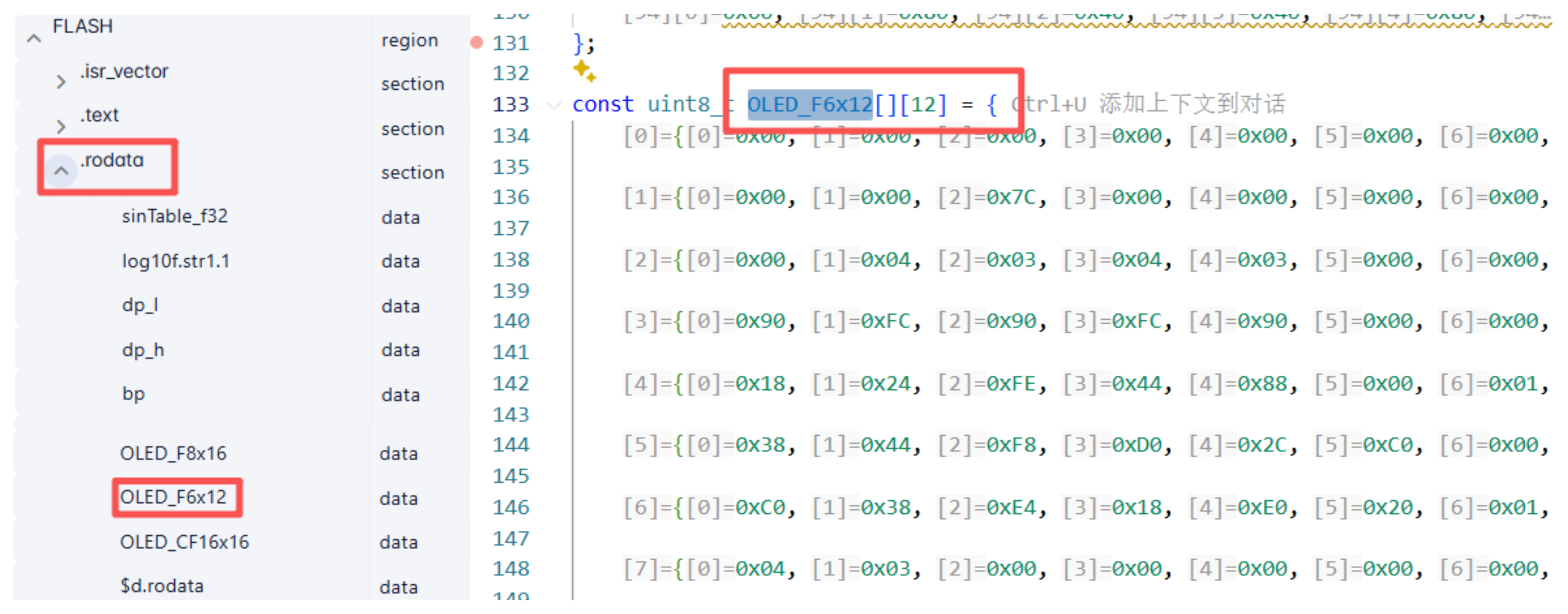 rodata数据段示例(const字体数组被编译归类到Flash rodata段)