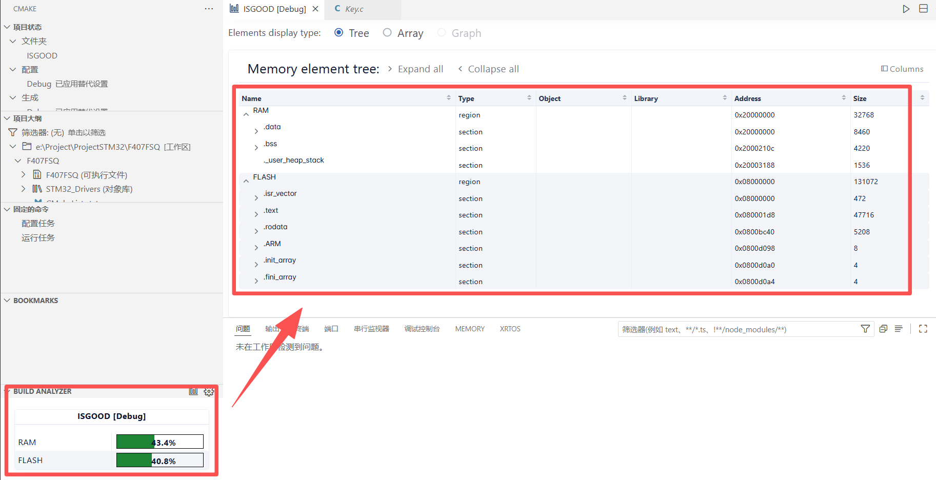使用CMake中的辅助工具,可以清晰看到代码编译后的内存分配