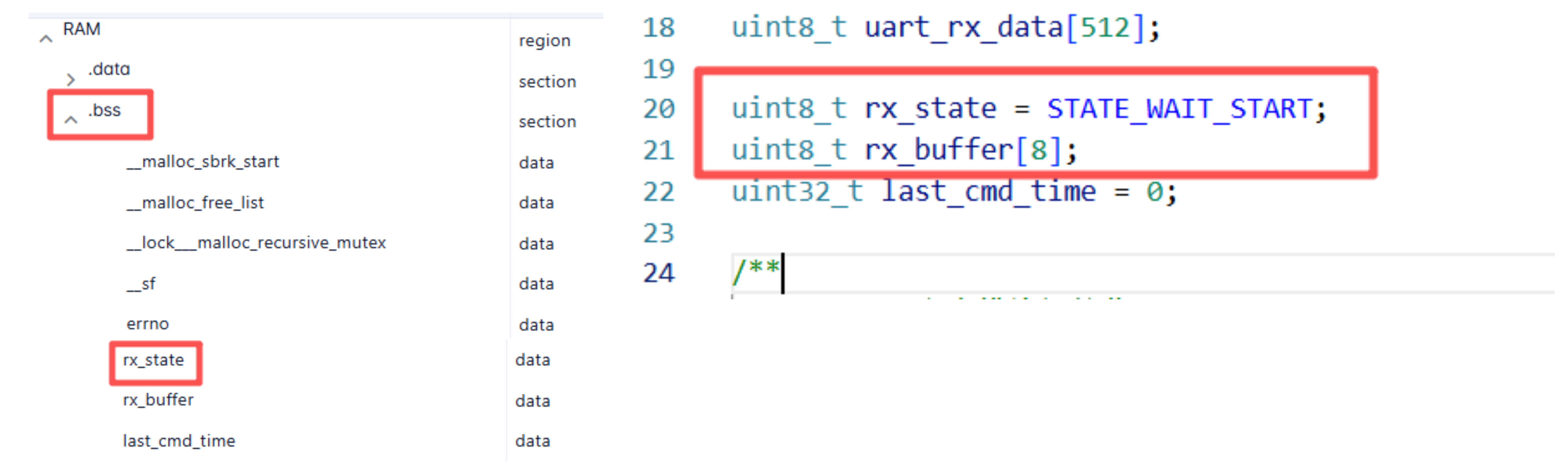bss数据段示例(未进行初始化或初始化为0的数据被编译归类为RAM bss段,注:STATE_WAIT_START = 0)