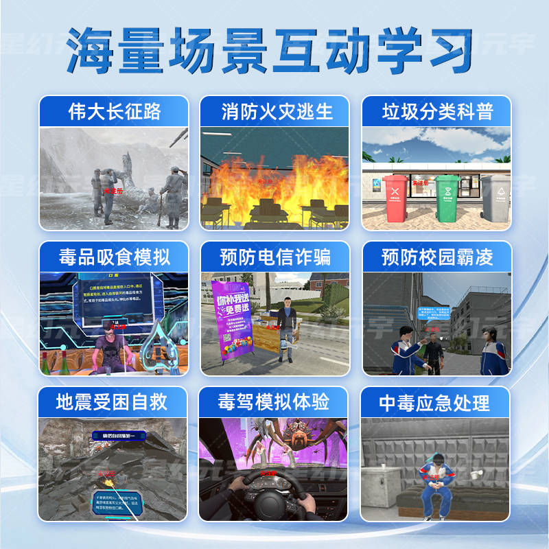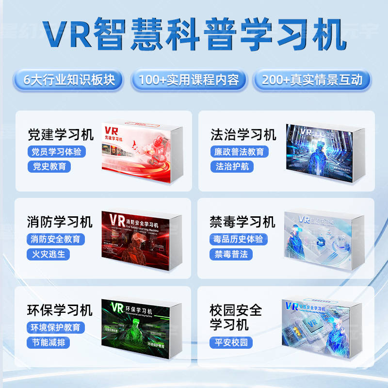 随着虚拟现实技术的迅速发展,教育行业迎来了前所未有的创新机遇。传统的教学模式逐渐无法满足现代教育对互动性、趣味性和深度学习的需求。VR科普学习机作为一款高科技教育工具,将虚拟现实技术与教育内容深度融合,极大提升了法治教育、消防安全教育、校园安全教育、禁毒教育和环保教育的效果,带来了全新的沉浸式学习体验。