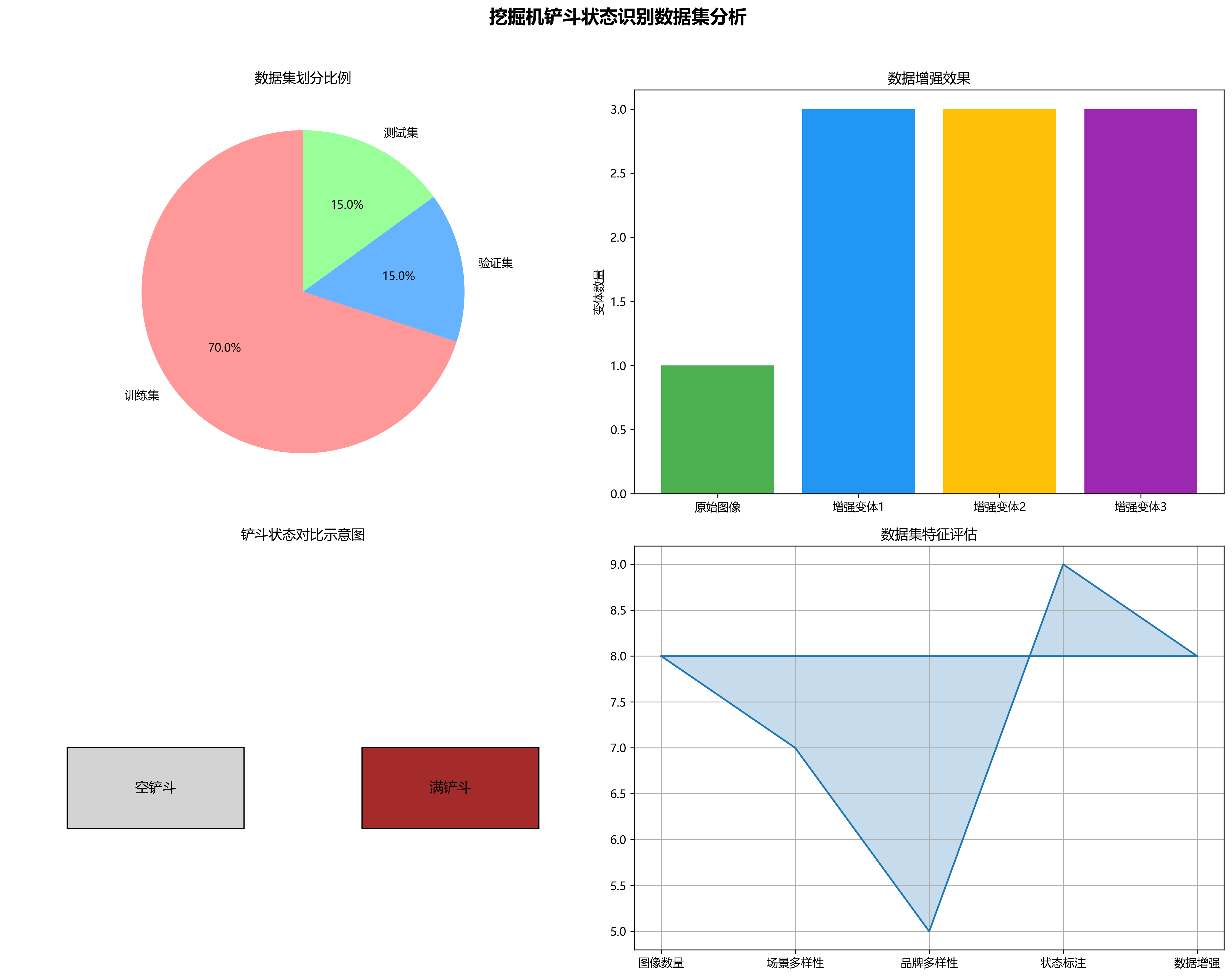 构建了专门的挖掘机铲斗状态识别数据集,并采用多种数据增强技术扩充数据。