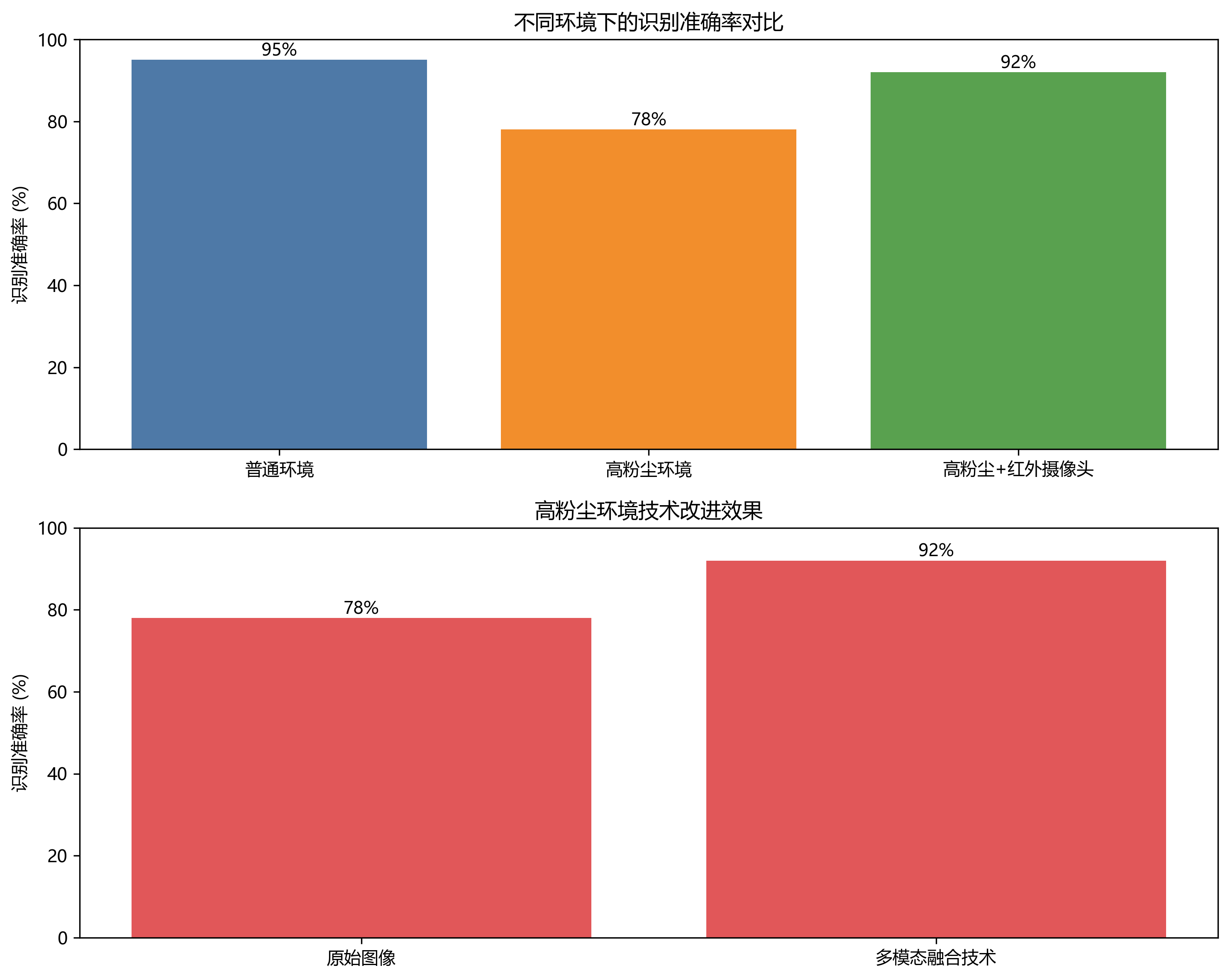 高粉尘环境:在矿山开采等粉尘较大的环境中,图像质量下降导致识别准确率略有降低,通过引入红外摄像头和多模态融合技术得到了有效改善。