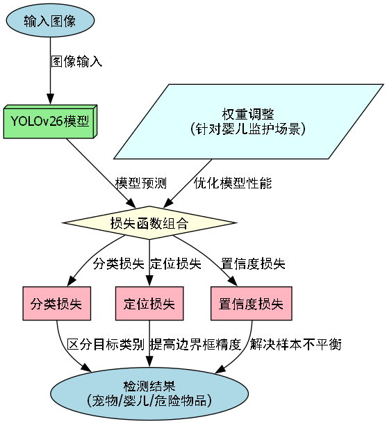这些损失函数的组合使得YOLOv26能够在多类别目标检测任务中取得更好的性能。分类损失确保模型能够准确区分宠物、婴儿和危险物品;定位损失提高边界框的精确度;置信度损失则解决了正负样本不平衡的问题。通过调整这些损失函数的权重,我们可以针对特定应用场景优化模型性能。例如,在婴儿监护场景中,我们可以提高婴儿类别的权重,确保婴儿检测的高准确性。