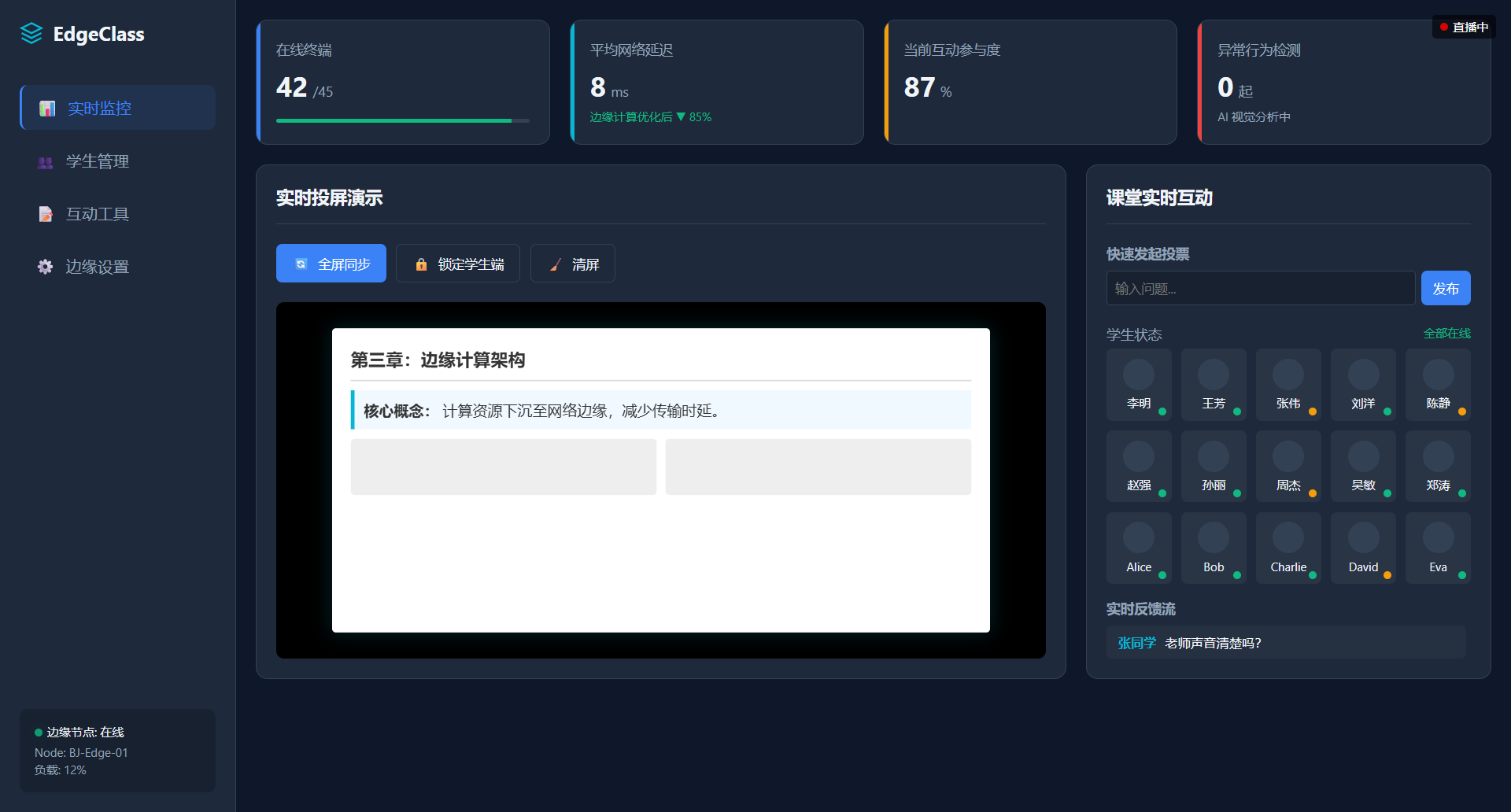 | 系统设计 | 1. 设计边缘计算节点处理模块,实现数据采集、处理和反馈。 2. 开发实时互动功能,包括教师与学生之间的互动。 3. 优化数据处理流程,确保系统实时性和低延迟性。 |