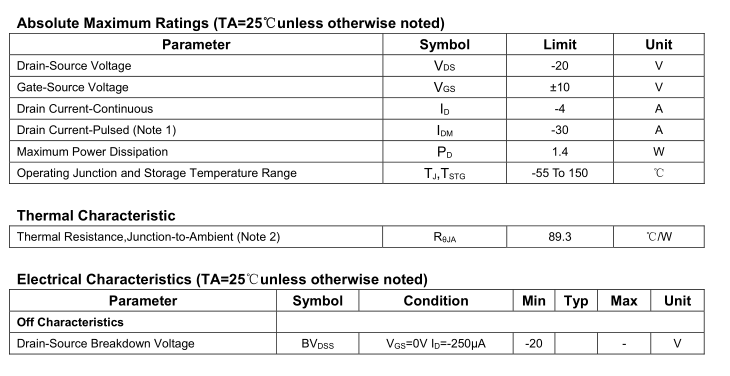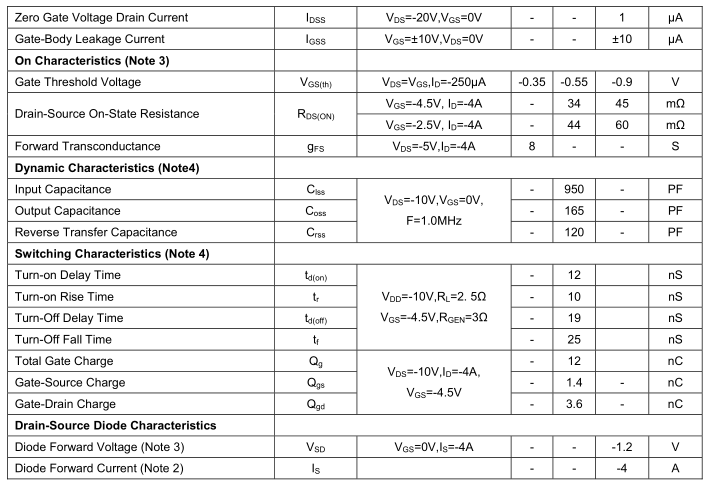 | ID(连续漏极电流) | -4A(25℃) | SOT-23 封装,大电流需 PCB 散热 |