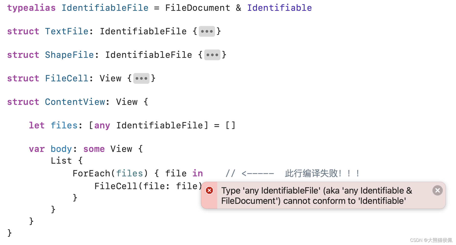 仔细观察顶部图片中的代码,可以发现我们的异构集合元素(IdentifiableFile 类型)都遵守 Identifiable 协议,为何会被 Compiler 光脑拒之门外呢?