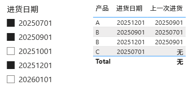 '进货表'[进货日期]) //从slicer选中的日期里,取最近的上一次进货日期