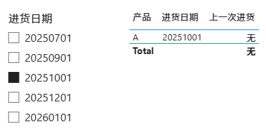 但是这种方法会有一个问题,即筛选器如果是单选,则无法显示上一次的进货日期