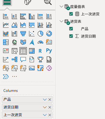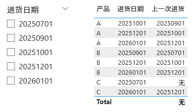 '进货表'[进货日期]) //单选,则从整张表里取最近的上一次进货日期