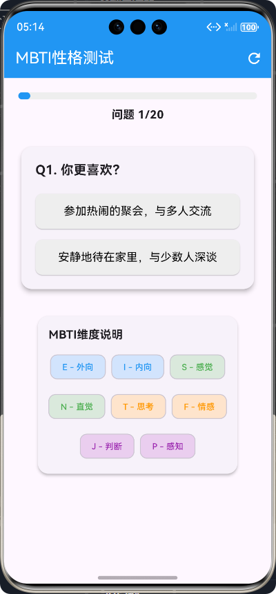 - 实现MBTI性格测试功能,包含20道测试题目
