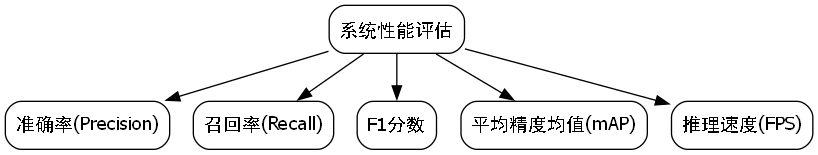 我们采用多种指标全面评估系统性能,包括准确率(Precision)、召回率(Recall)、F1分数、平均精度均值(mAP)和推理速度(FPS)。准确率衡量模型预测为正的样本中有多少是真正的正样本;召回率衡量所有正样本中有多少被模型正确识别;F1分数是准确率和召回率的调和平均;mAP则在不同IoU阈值下计算AP的平均值,更全面地评估模型性能。