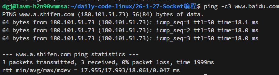 如果不想一直ping,而是ping n次就结束,我们可以加上次数ping -c3 此时就只会ping1次结束