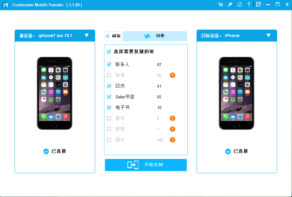 快速将联系人、书签、日历、电子书和备忘录从 iPhone 传输到 iPhone。