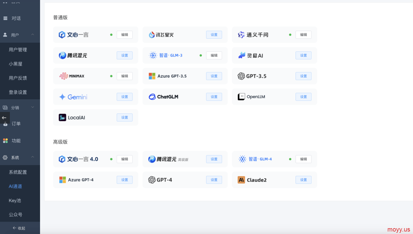 ai通道:文心一言、MiniMax、智谱AI、通义千问、GPT-3.5、Azure GPT-3.5、Gemini、讯飞星火、腾讯混元、灵犀AI、ChatGLM、OpenLLM,GPT-3.5、Gemini是国外接口哦~