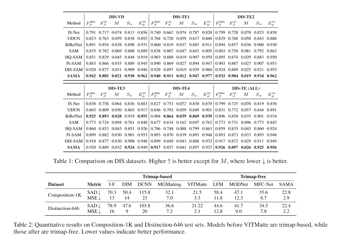 在分割和抠图两大任务的标准数据集上,SAMA表现亮眼: