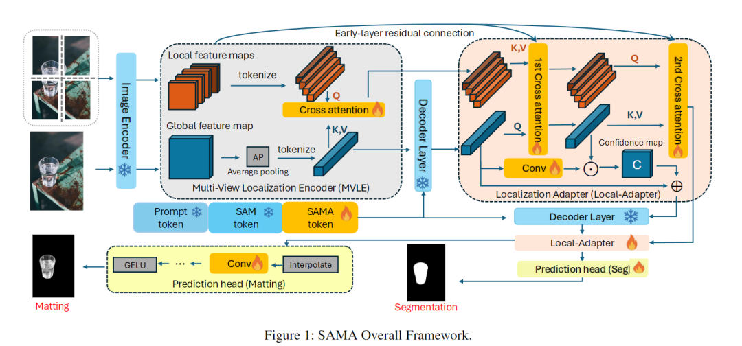 借鉴人类"远看全局、近看细节"的视觉逻辑,SAMA将输入图像分成4个不重叠的局部补丁,每个补丁放大后与原图一起输入编码器。通过跨注意力机制对齐局部细节和全局信息,解决了SAM仅靠全局特征无法捕捉精细结构的问题。