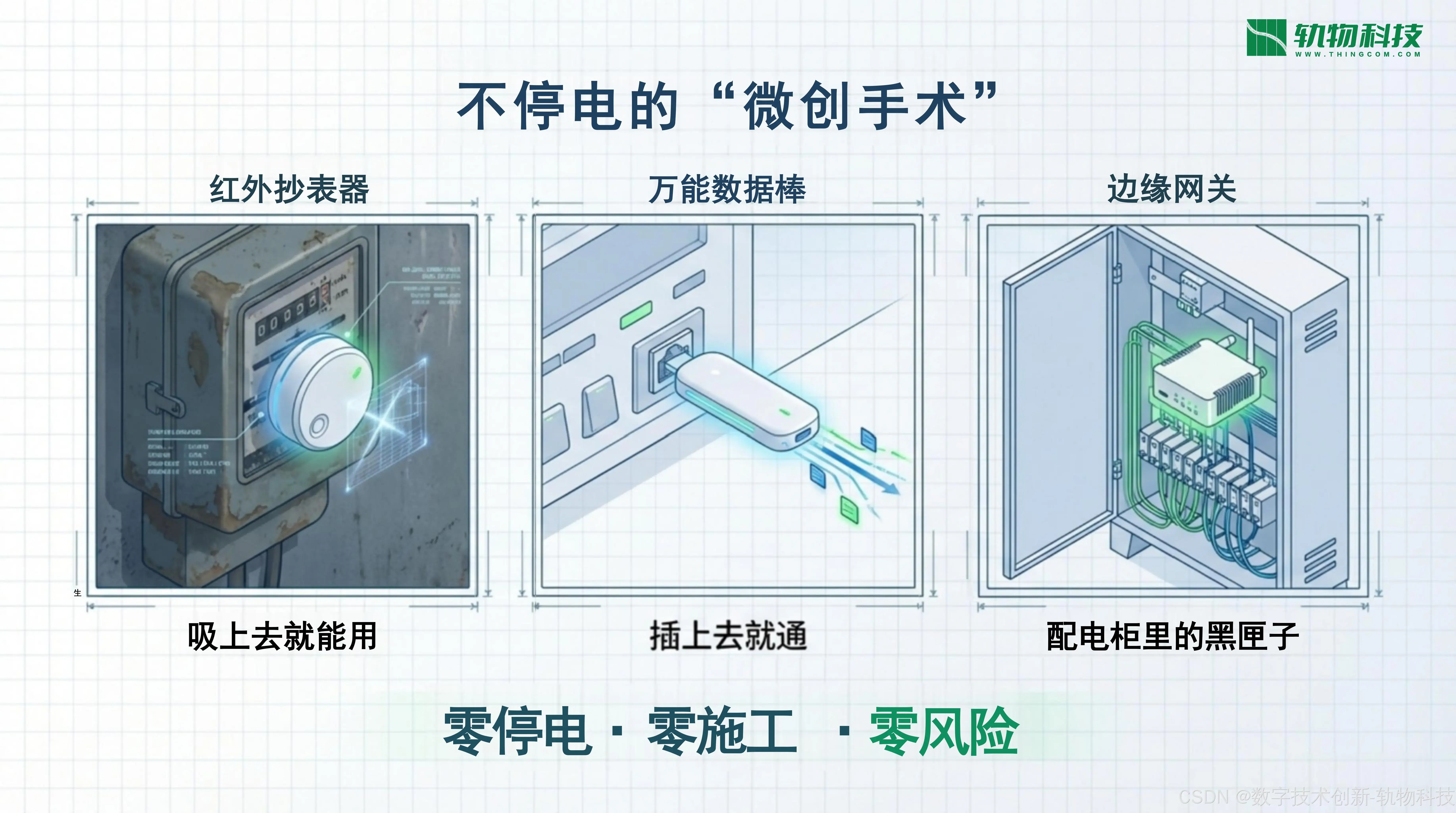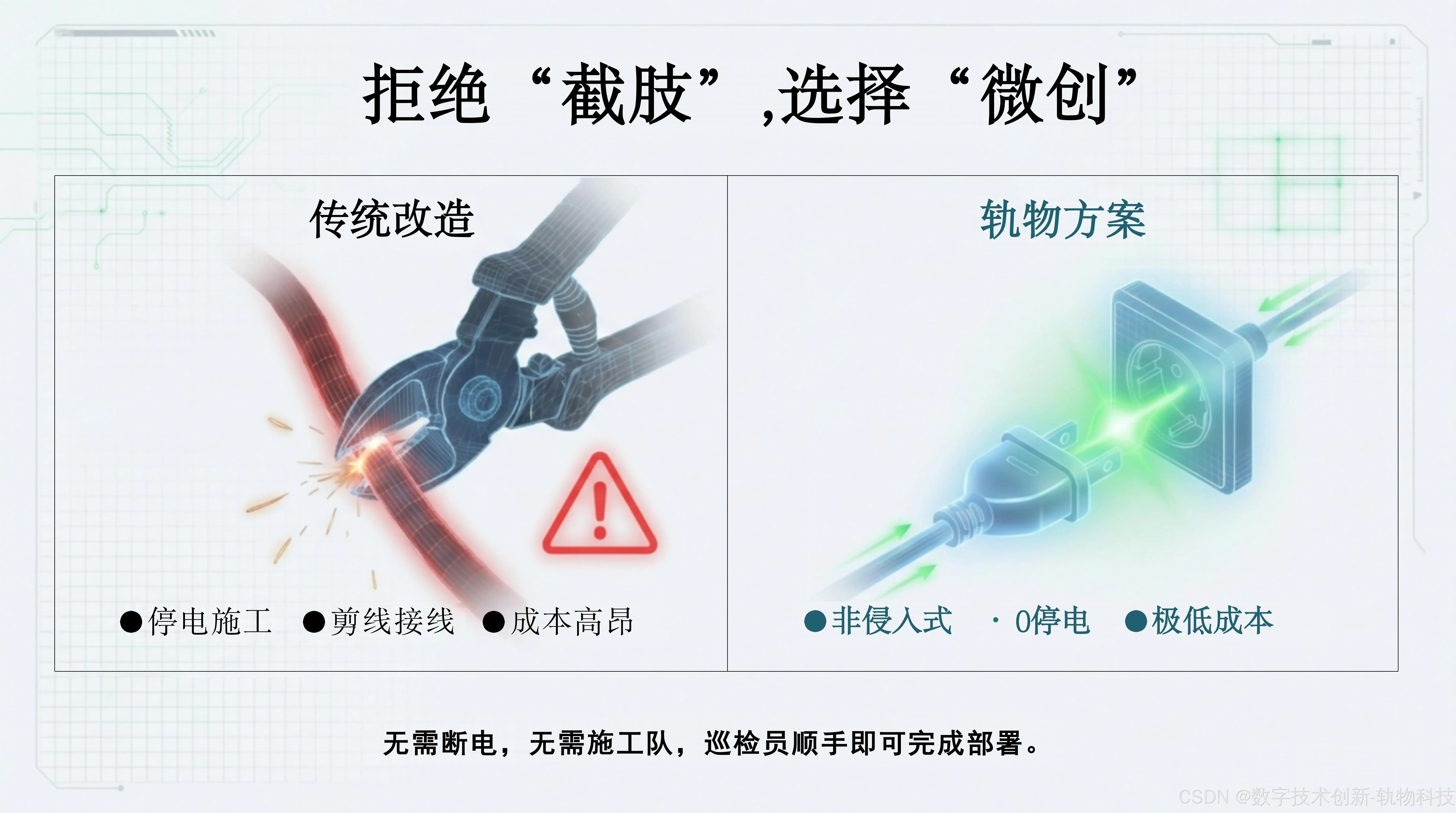 相对于传统技改如同"截肢"般的停电、剪线、高成本改造,轨物科技倡导"微创手术"级的数字化升级。