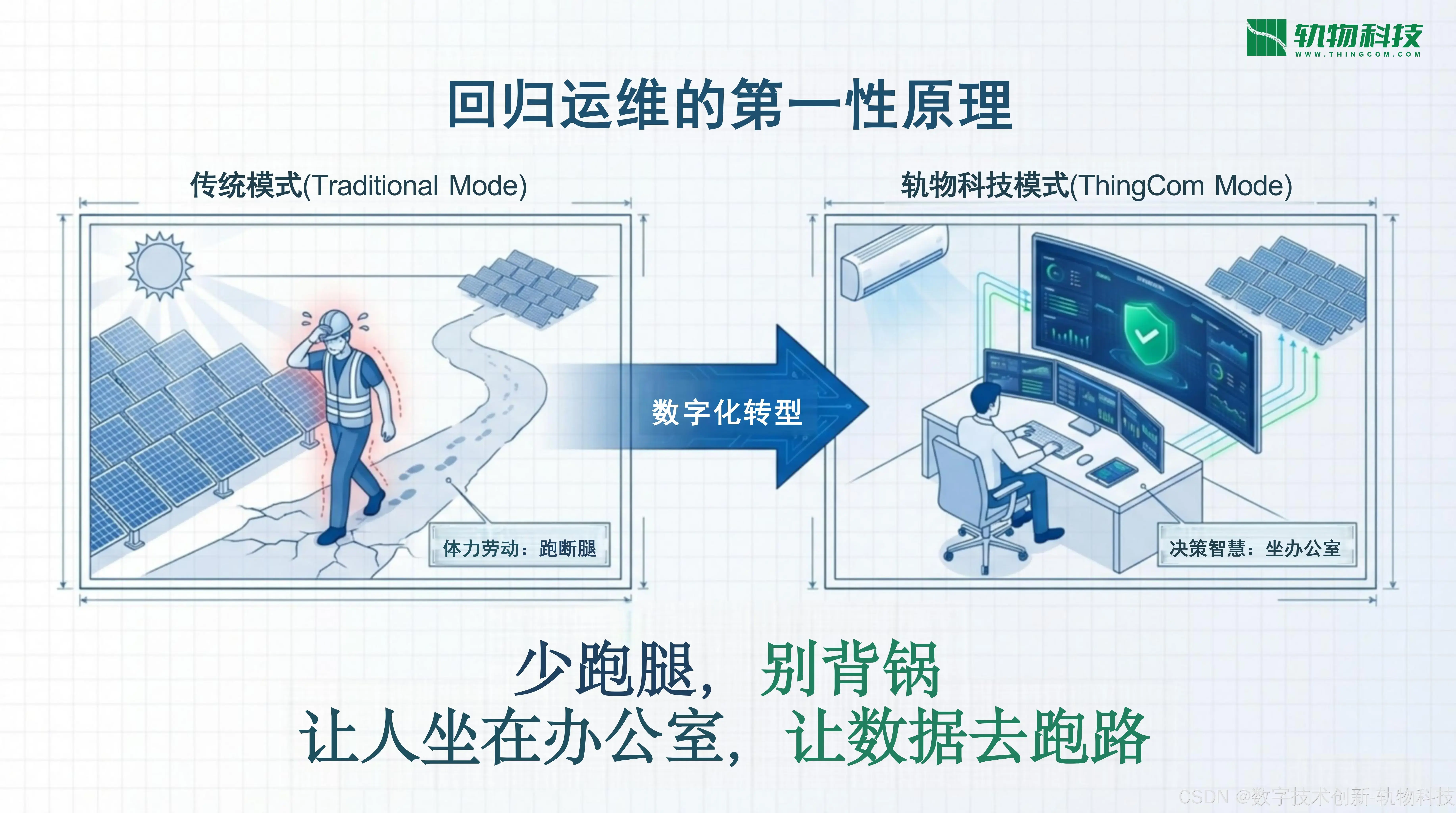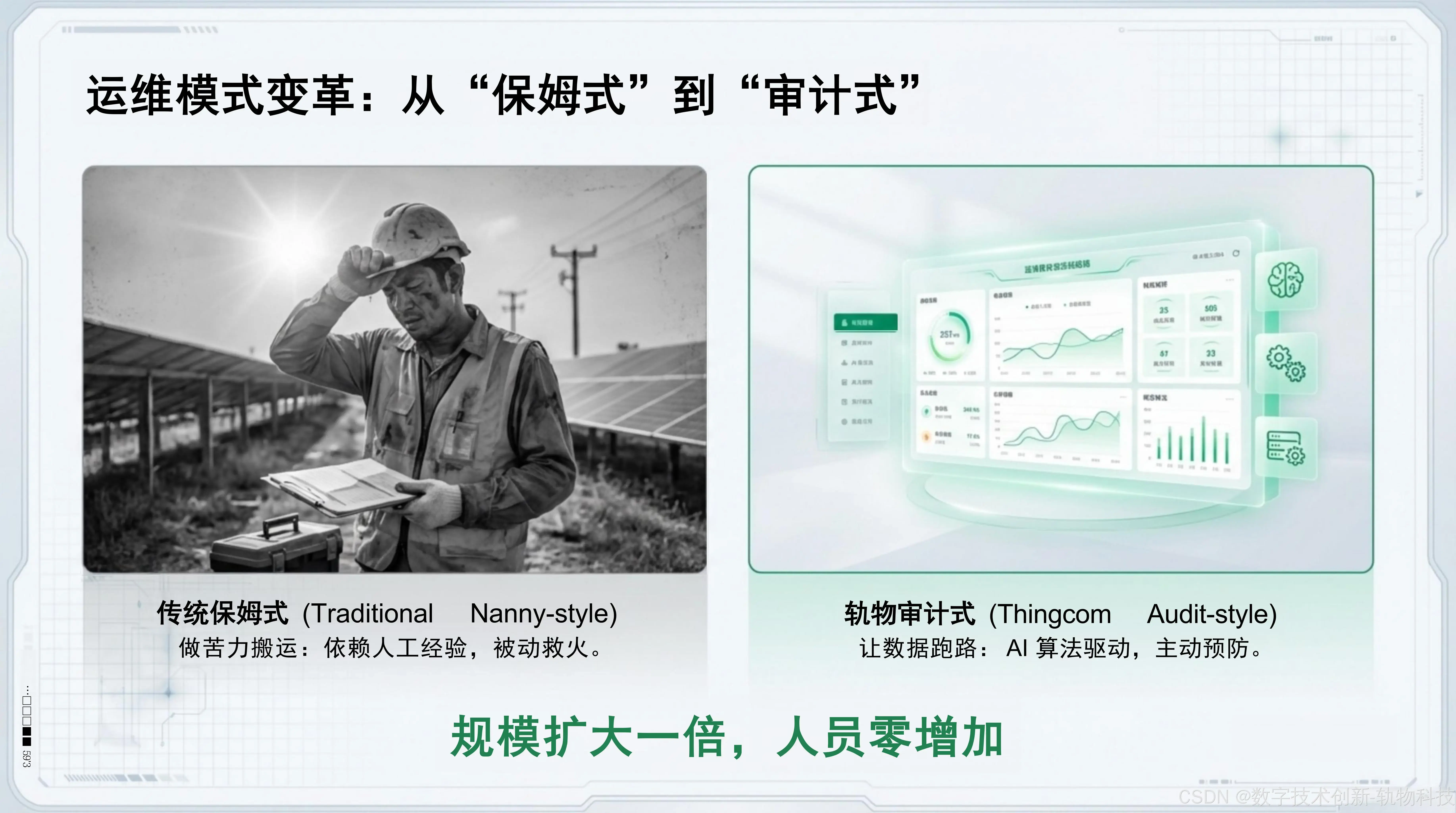 - 黑洞二:效率低------"保姆式运维"的末路。 传统运维依赖"苦力搬运"和人工抄表,据统计,人工巡检相关支出占OPEX的90%以上。在这种低效模式下,运维人员疲于奔命却依然"看不见"真相,导致资产长期处于亚健康状态。