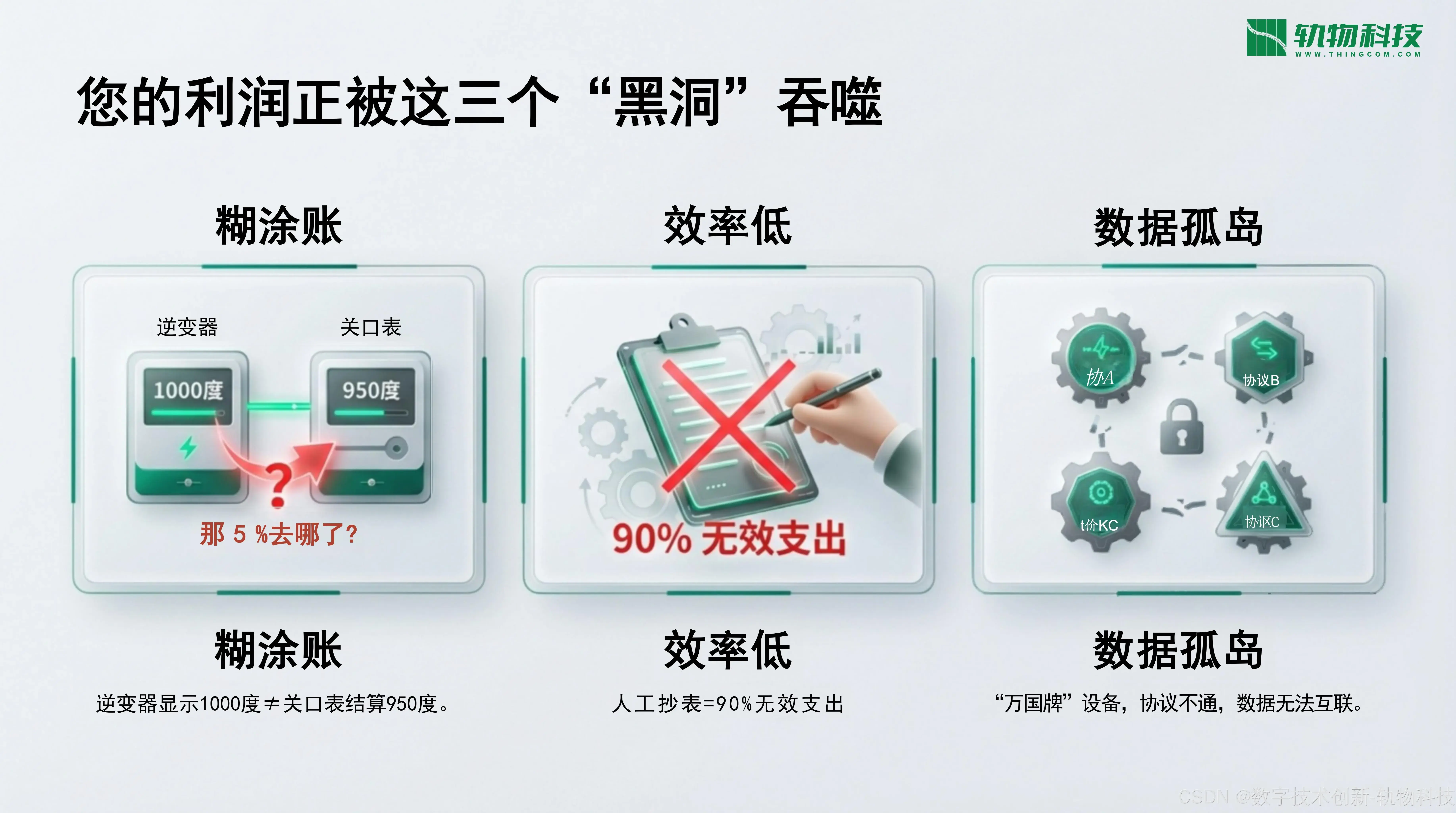 - 黑洞三:器材杂------"数据孤岛"导致的管理盲区。 早期电站由"万国牌"设备拼凑而成,协议不通、数据断裂,管理者在决策时犹如"盲人摸象"。