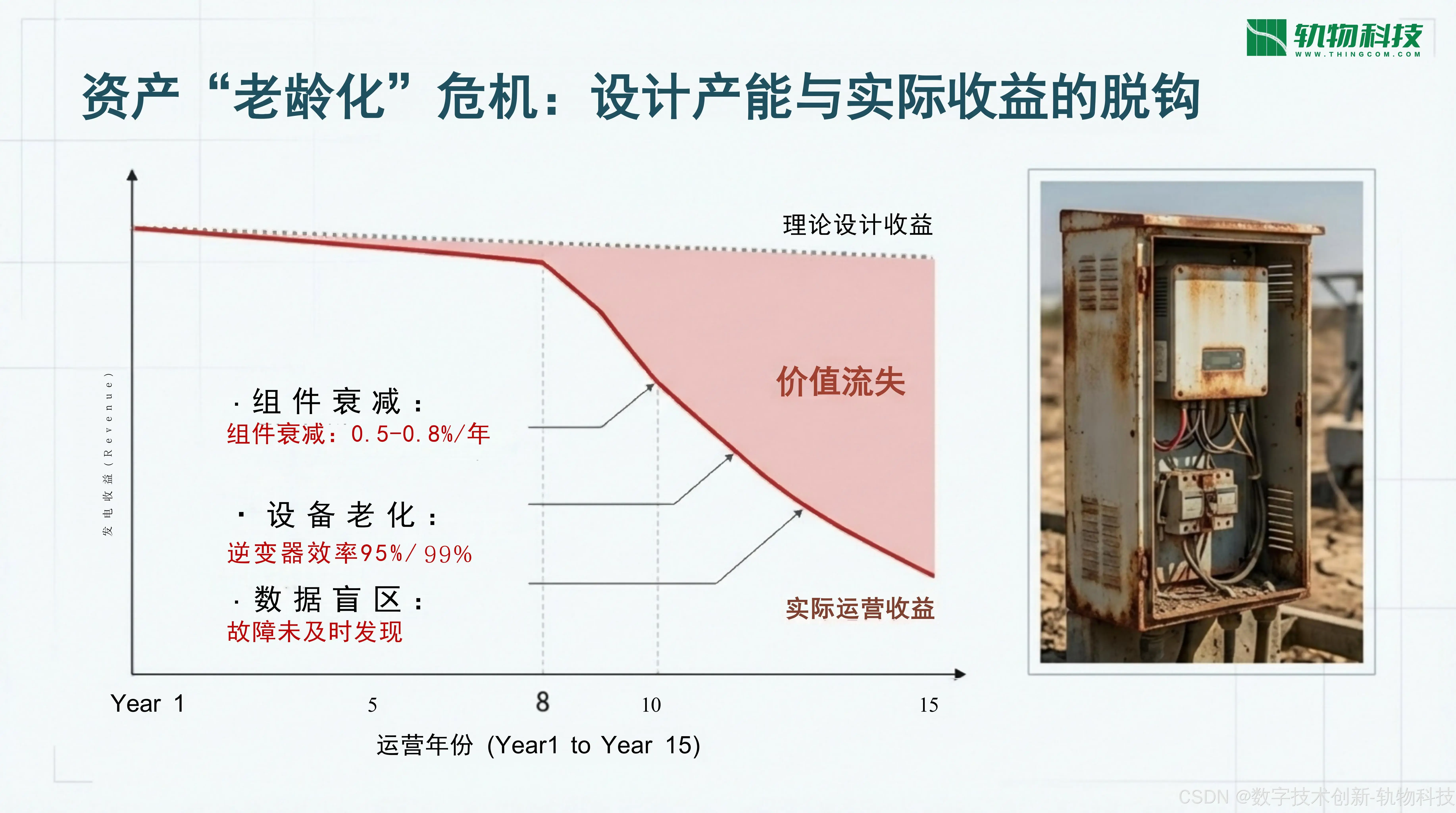 然而,早期建设的"老旧电站"(运行10年以上)正面临严峻的资产减值风险。受限于当年的组件转换效率(P型多晶/单晶,效率普遍低于18%)及陈旧的系统拓扑,这些资产普遍存在PR值(系统效率)持续走低、低功率组件老化、系统性故障频发等痛点,导致其度电成本(LCOE)在当前电力市场竞争中居高不下。