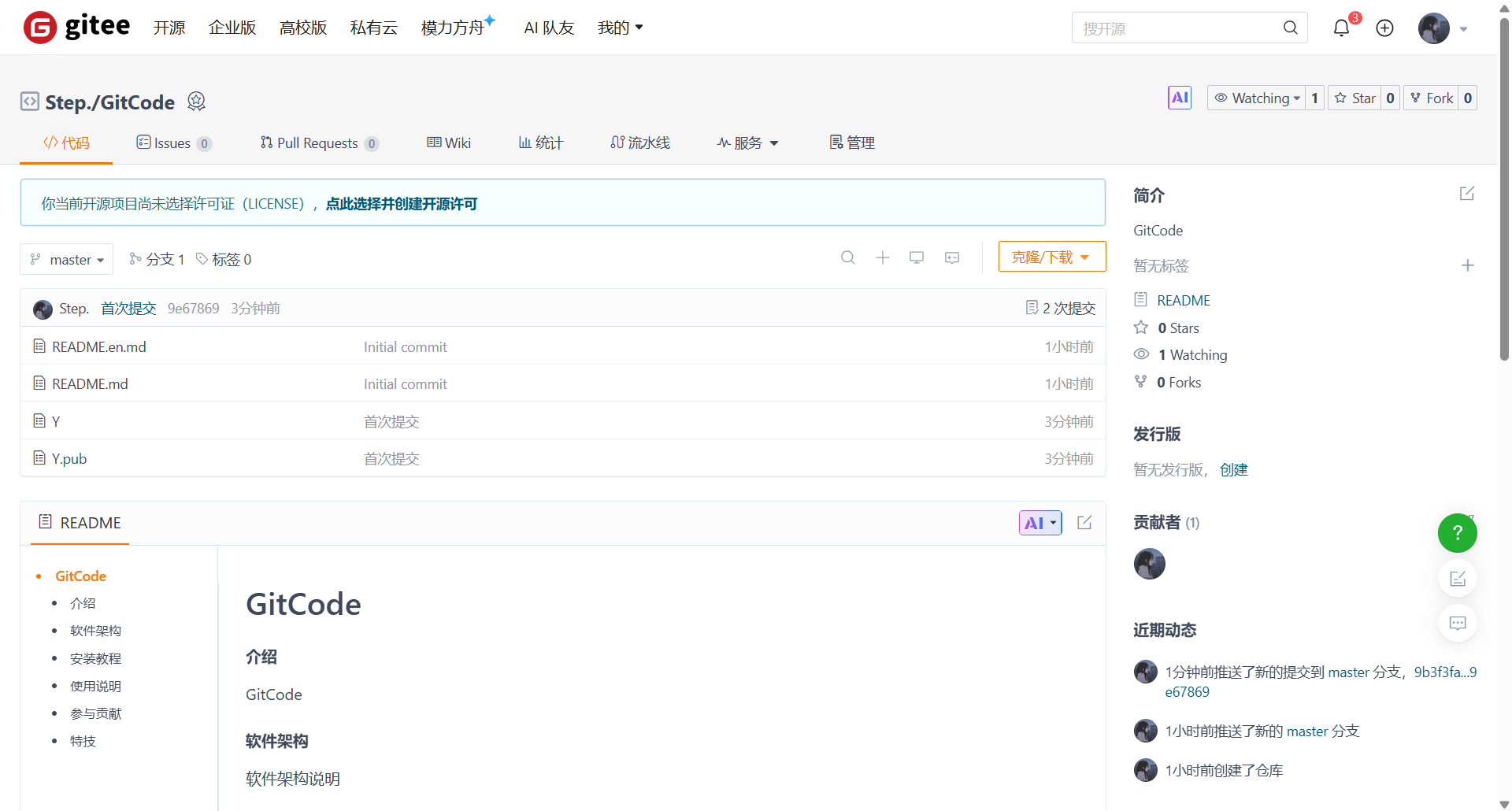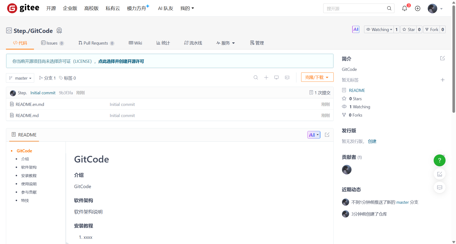 - 使用Readme文件初始化仓库 :勾选此项后,平台会自动在仓库中创建一个名为
