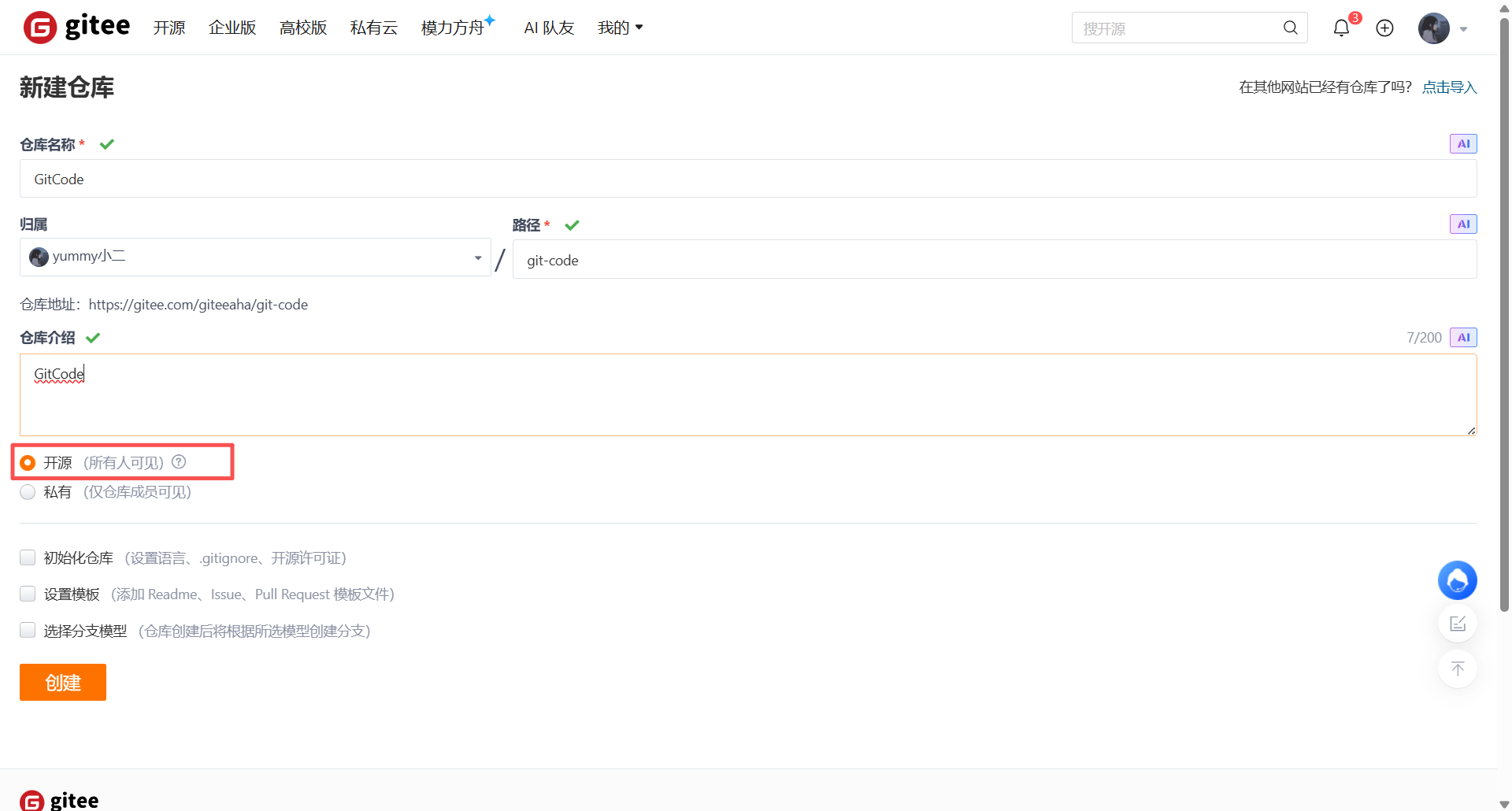 - 开源/私有:这是决定仓库可见性的关键选项。开源仓库对所有人可见,任何人都可以克隆和查看代码;私有仓库则仅对仓库所有者和被授权的协作者可见。