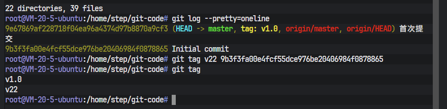 再次查看标签列表,可以看到v22已经成功创建并指向了指定的历史提交。