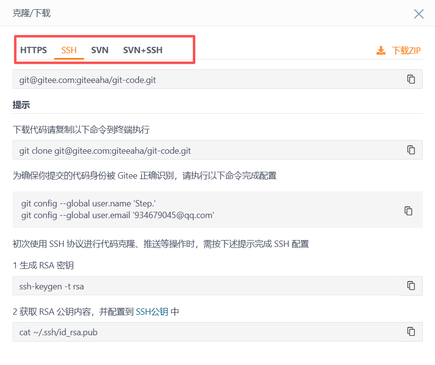配置完成后,就可以使用SSH地址来克隆仓库了,其操作与HTTPS完全相同,只是URL的格式不同(以git@gitee.com:开头)。