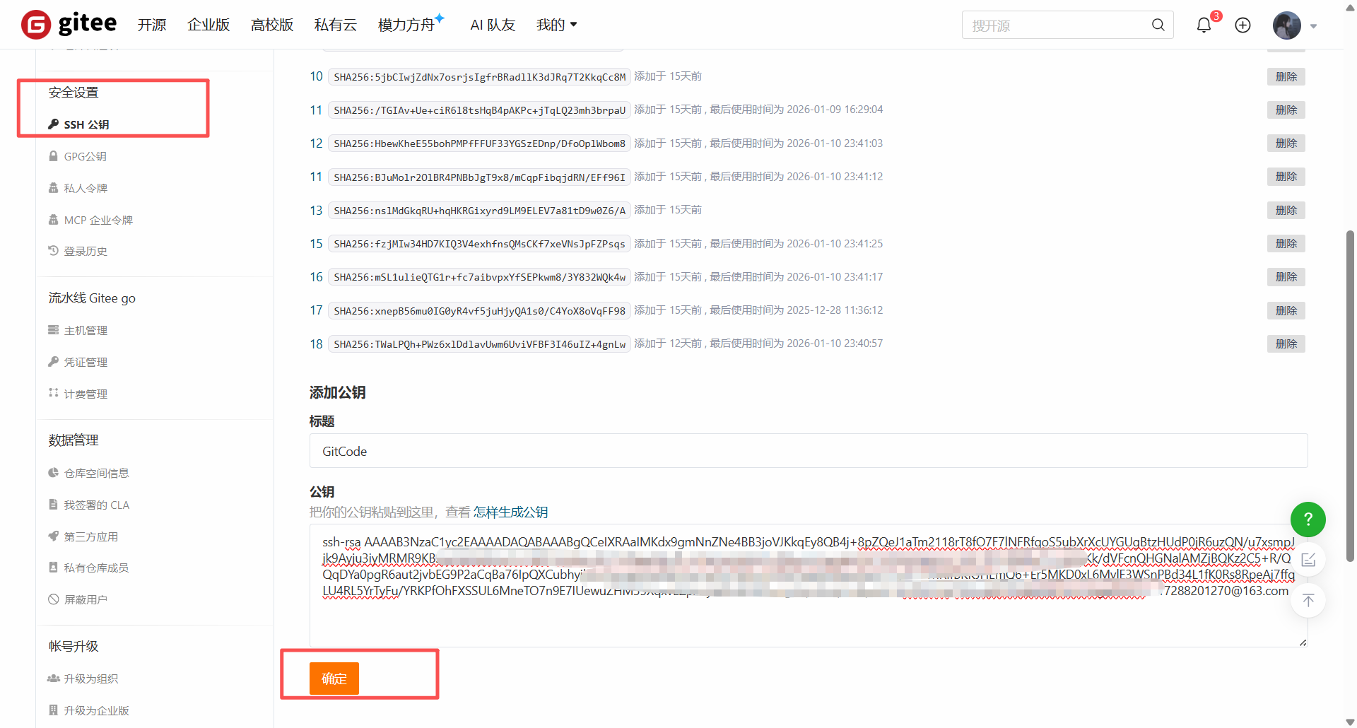 点击"确定"后,Gitee就记录了这台计算机的"身份指纹"。从此,在这台计算机上使用SSH协议对该Gitee账户下的仓库进行任何操作,Git都会自动利用本地的私钥完成签名认证,整个过程无缝且无需输入密码。