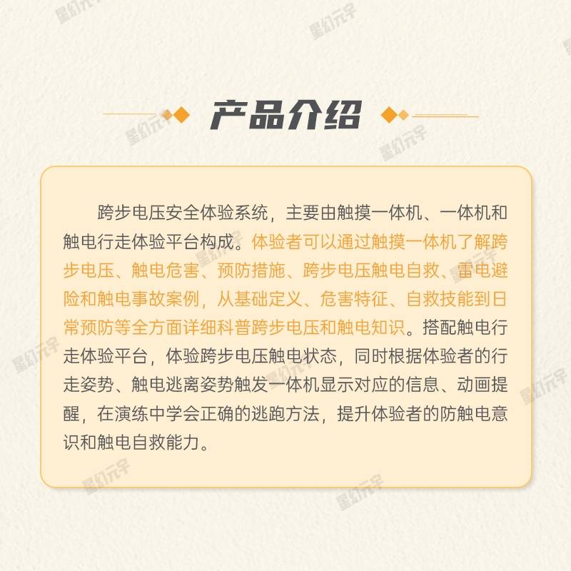 为了帮助公众正确识别和应对跨步电压的风险,跨步电压安全体验系统通过直观的互动体验,使参与者能够了解其基本原理、危害性以及自救方法,进而提高他们的电力安全防范意识。