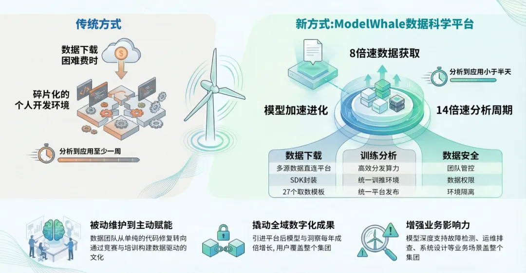 该风电企业与和鲸的合作,生动诠释了"人工智能+制造"的成功,依赖于一个能够整合数据、赋能人才、协同流程的坚实"数字基座"。通过构建这一基座,该企业不仅解决了长期存在的效率与协同瓶颈,更锻造了面向未来的核心竞争力------一种敏捷、持续进化的数字化组织能力。