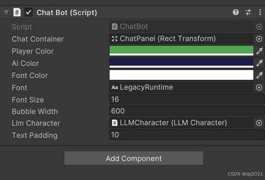 | UI elements | Player Text | InputField | 玩家输入问题的地方(聊天输入框) | 是 | 提交后触发 OnInputFieldSubmit → 调用 RAG 检索 → LLM 生成回复 |