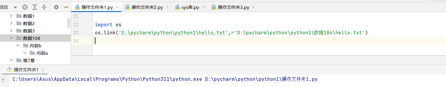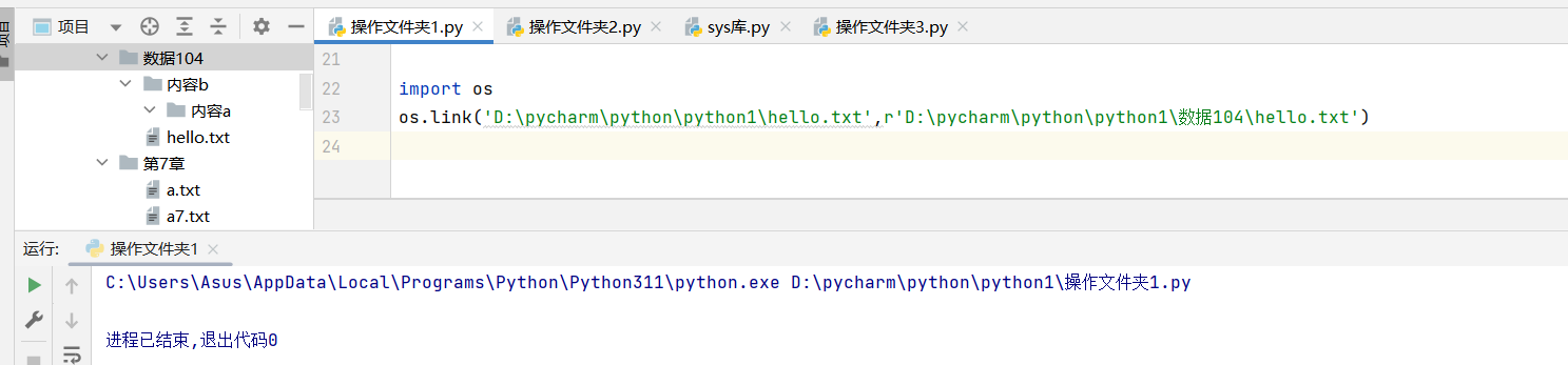 os.link('D:\pycharm\python\python1\hello.txt',r'D:\pycharm\python\python1\数据104\hello.txt')
