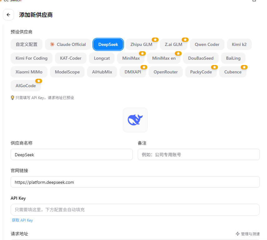 安装好CC-Switch后,添加一个deepseek配置,需要配置好API Key,API Key需要在Deepseek上获取,配置好后点击保存
