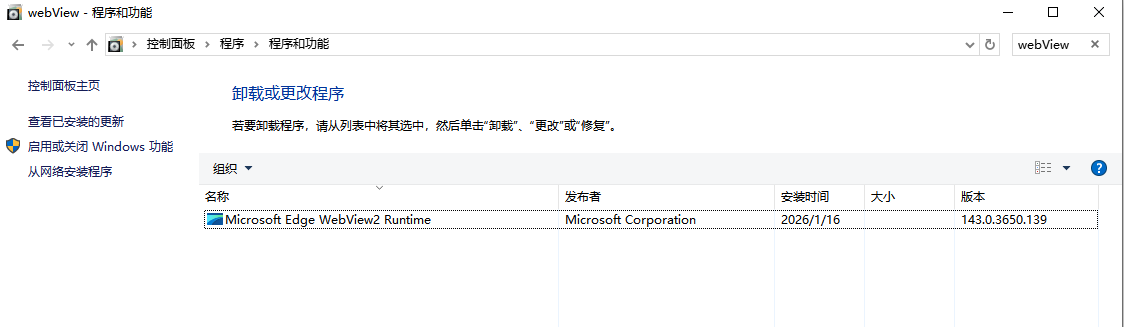本地是否安装WebView2可以在控制面板-程序-程序和功能中查到