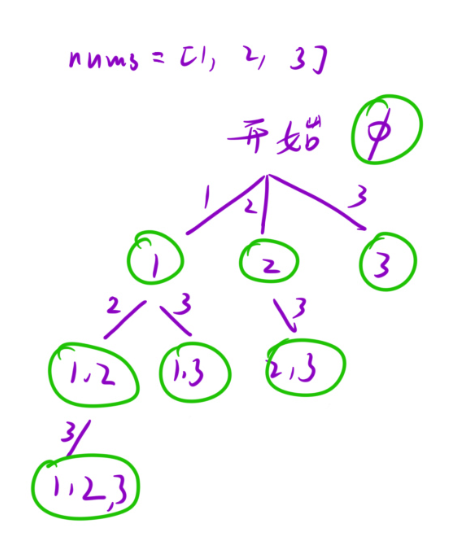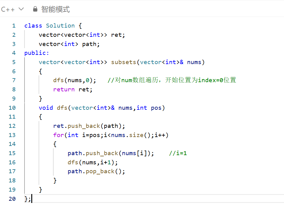 解题思路:利用排列组合知识画出分析图!我们发现所有节点就是要求的答案,因此在每次进入dfs函数之后,都要把这个"路径"加入到ret中!之后利用for 循环来确定遍历的开始位置