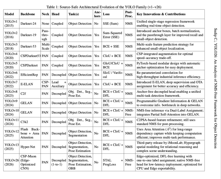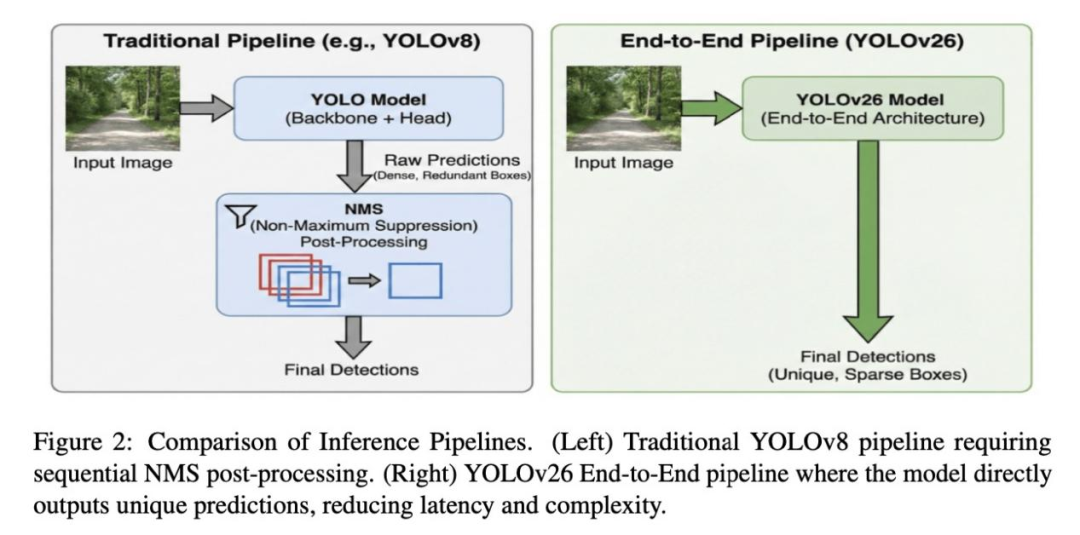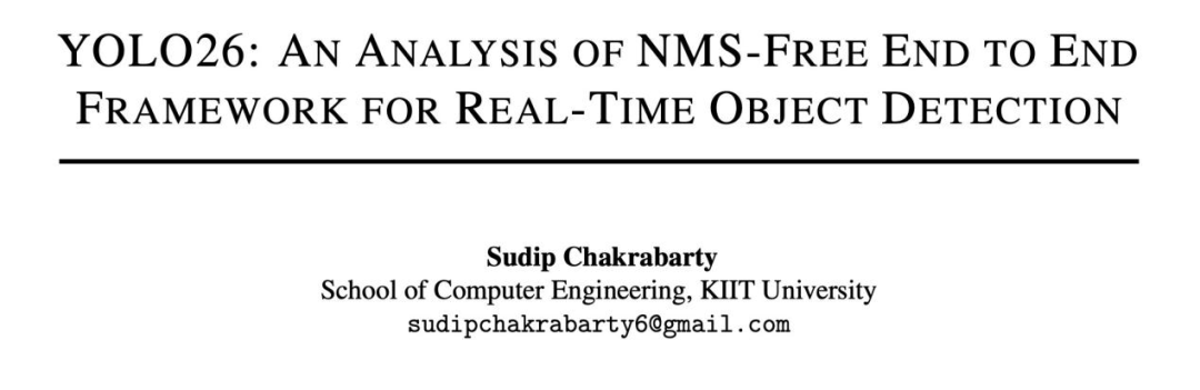 最近,计算机视觉领域再掀波澜!YOLO 家族最新成员------YOLO26横空出世,以"彻底移除NMS"为核心变革,开启了真正的端到端目标检测新时代。虽然官方论文尚未正式发布,但来自KIIT大学的深度分析报告已在arXiv上公开,详细剖析了这一颠覆性架构的设计哲学与技术实现。