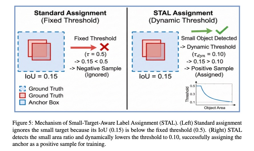STAL(Small-Target-Aware Label Assignment)机制通过动态调整IoU阈值解决了这一问题。当检测到小目标时,STAL会自动"放宽"匹配标准,降低所需的IoU阈值,确保这些小物体也能获得充分的训练监督。