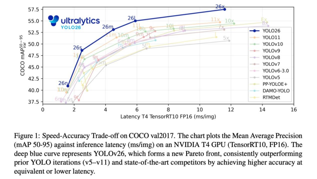 **YOLO26-x:**达到57.5 mAP的顶尖精度,延迟控制在11.5ms以内