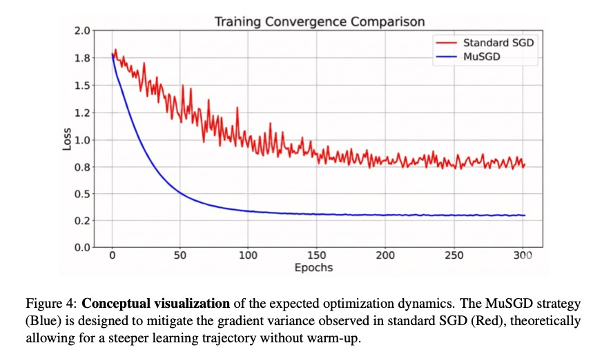 MuSGD执行一种"矩阵正交化"更新,能最大化参数更新的效率。相比传统SGD,它能让模型在训练初期就找到更陡峭、更有效的学习路径,减少梯度方差,在不依赖复杂预热策略的情况下实现更快、更稳定的收敛。