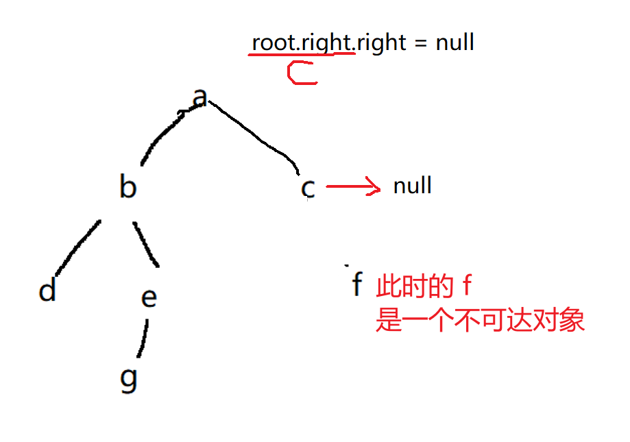 那么,f 节点对象,就会被当作 垃圾,被 GC 回收。