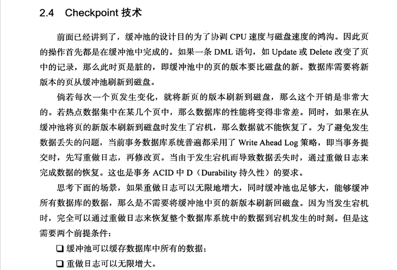 | 缩短数据库恢复时间 | 宕机后,只需恢复 Checkpoint 之后的重做日志,无需回放全部历史日志,大幅提升恢复效率。 |