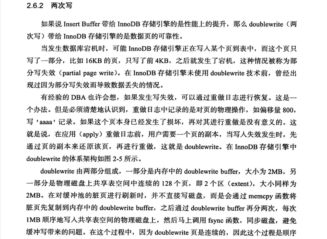 fsync()函数,确保数据真正落盘,避免操作系统缓存带来的风险。这个过程是顺序 IO,因为 Double Write 区域是连续的,磁头不需要来回移动,性能开销很小。 -